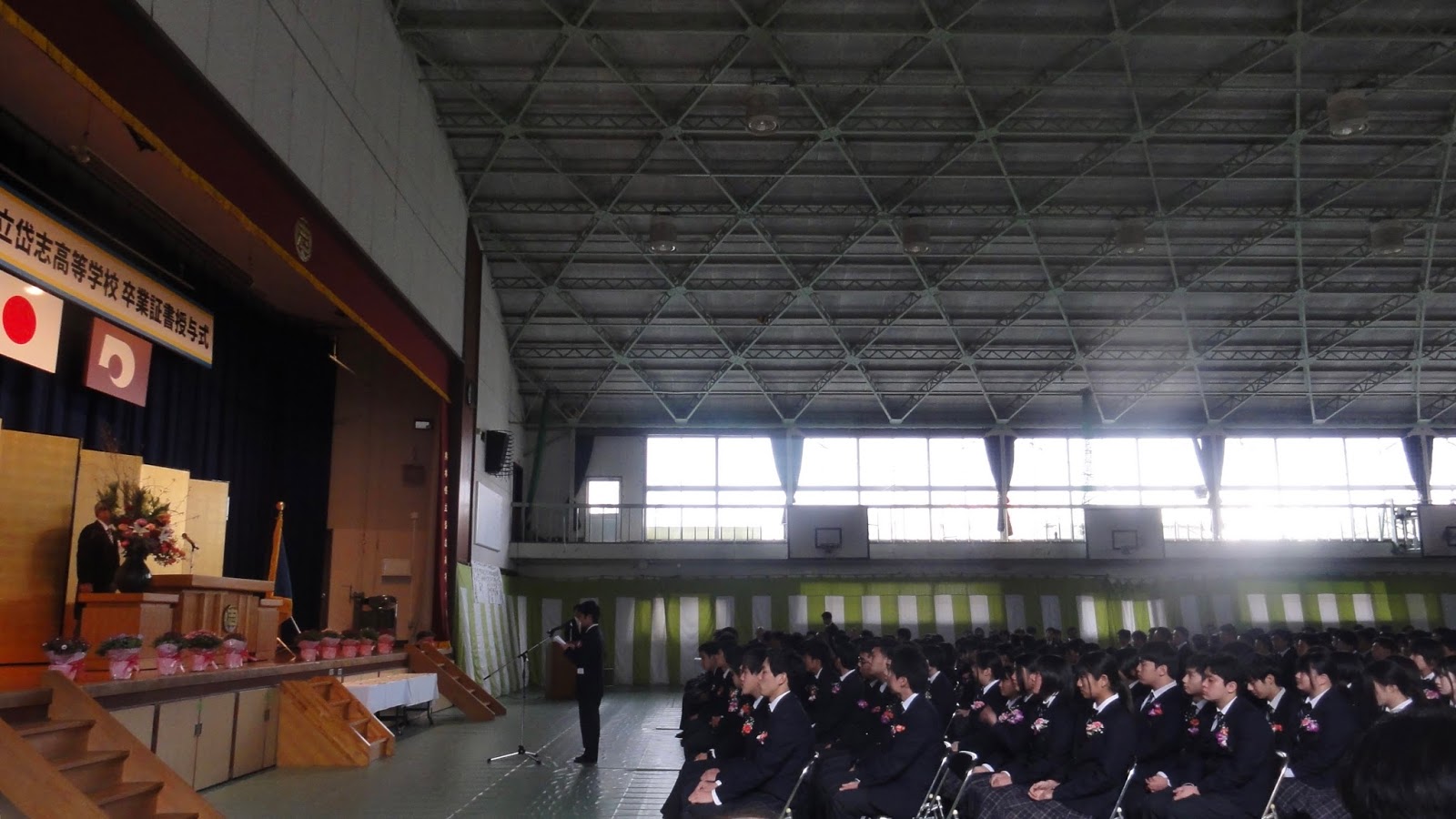 3年間でたくましくなったなぁ〜 。入学式のときの出迎えたもんね。3年前〈荒尾高校〉と〈南関高校〉が統合して新しい[岱志高校]が誕生し、その最初の入学生で第一回の卒業生です。前日の春の嵐で、鹿児島本線が遅れたり、体育館の照明が使えないと言うアクシデントがありましたが、みんなの、一生懸命過ごしてきた3年間の様々な思い出をかみしめながらの卒業式は無事、滞りなく終了しました。剣道部の山本蒼馬君の、誠実な生真面目な答辞が生徒たちの涙を誘いました。水元校長先生からお聞きしましたが、熊本大学法学部に合格したそうです。112名のそれぞれの感動の卒業式でした。